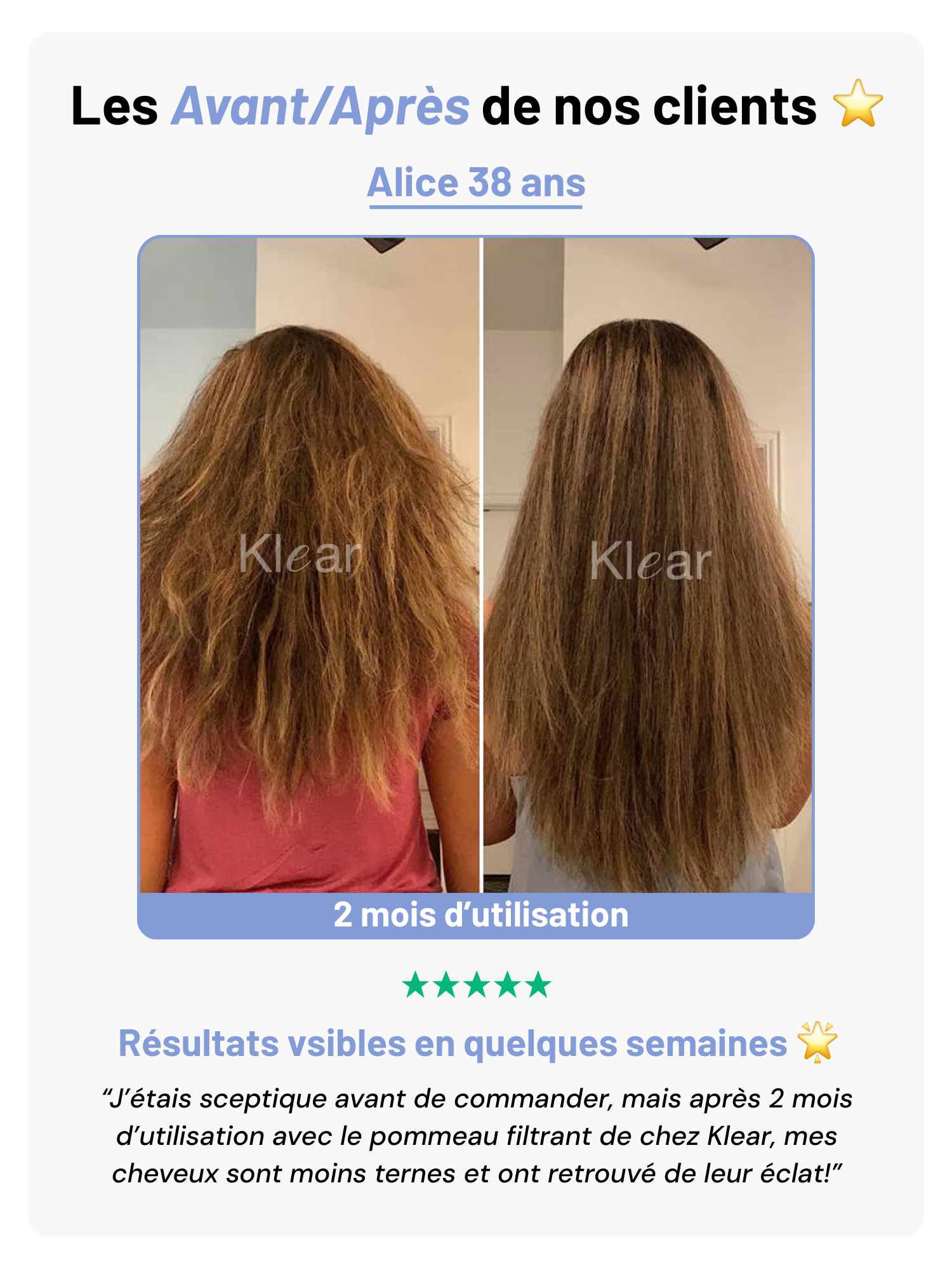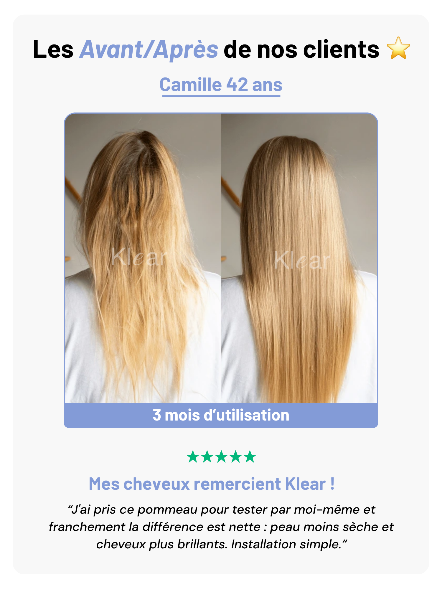 Après quelques jours d'utilisation du pommeau de douche anti-calcaire Klear, voici les résultats attendus :